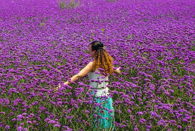 馬鞭花景區,近百畝馬鞭草花田里,鮮花盛開(kāi)。遠遠望去,如同為綠色大地鋪上一層紫色的地毯。微風(fēng)拂動(dòng)下,紫色的馬鞭草愈發(fā)動(dòng)人,吸引了不少游客前來(lái)拍照留影。